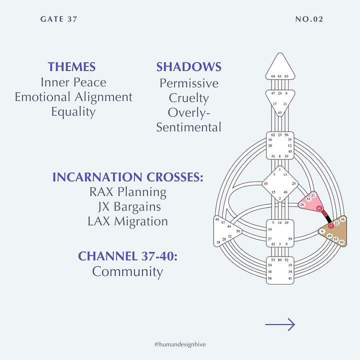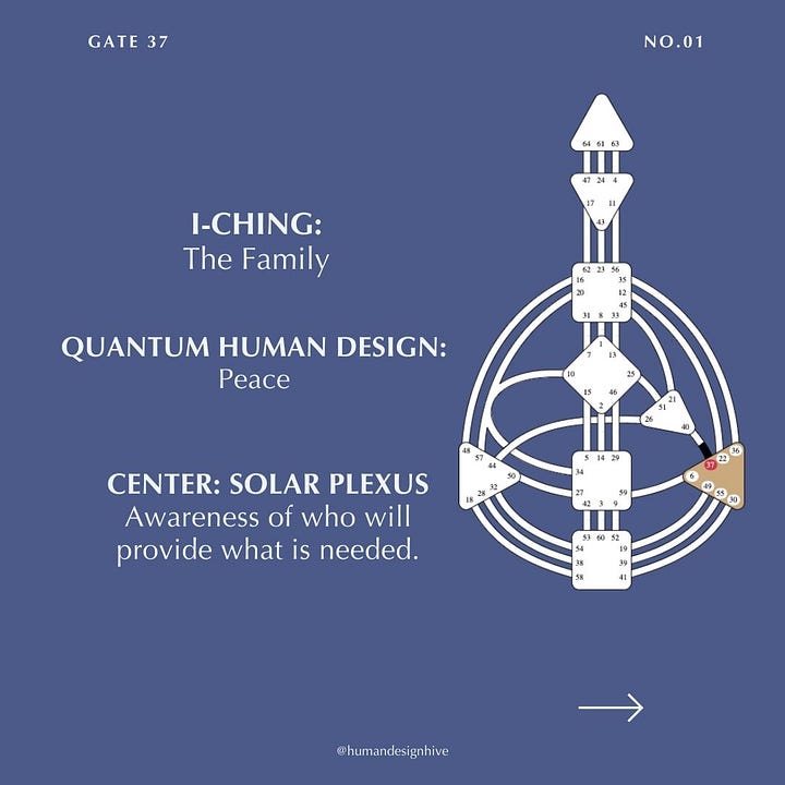 People with gate 37 in their design are usually central figures in maintaining the cohesion of both family and communal groups through their inherent warmth, approachability, and caregiving instincts.